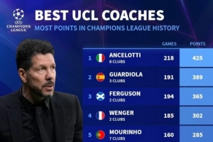 體育資訊4月15日訊 德國轉(zhuǎn)會(huì)市場列出了歐冠主帥積分榜,安切洛蒂、瓜迪奧拉、弗格森前三,西蒙尼第六。
