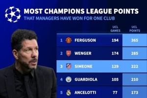 執(zhí)教單一俱樂部歐冠拿分榜:(淘汰賽勝利計(jì)為3分)