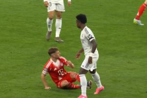 比賽第9分鐘,維尼修斯拼搶時先是絆倒了基米希,然后又上手將本就倒地的后者一把推翻,被裁判口頭警告。