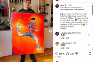 體育資訊3月26日訊 西班牙中場佩德里更新社媒動(dòng)態(tài),曬出與一幅以他為主題的畫作。