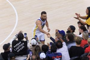 庫里絕命三分后倒在觀眾席,被一名快船球迷推開,但這名臉色鐵青的球迷最后雖然沒看庫里,但還是和庫里碰了拳,給予了瑞思拜。