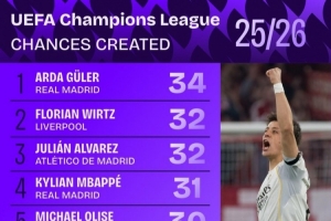 體育資訊4月16日訊 Squawka統(tǒng)計了本賽季歐冠球員創(chuàng)造機會的次數(shù),并列出榜單,居萊爾34次居首。