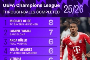 體育資訊4月16日訊 Squawka列出了本賽季歐冠成功直塞傳球排名,奧利塞8次居首,亞馬爾7次第二。