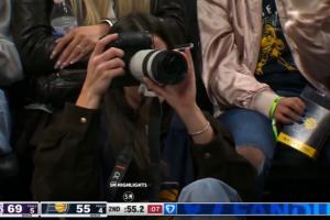 體育資訊3月26日訊 NBA常規(guī)賽,步行者對(duì)陣湖人,克拉克客串場(chǎng)邊的攝影師。
