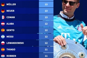 吉格斯、穆勒、諾伊爾、金斯利·科曼:13次