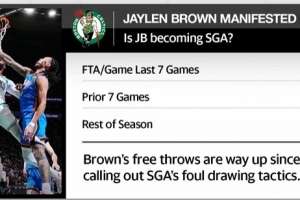 對(duì)此,名記Kevin O'Connor表示:“布朗是否憑借賽季末段更多的罰球,實(shí)現(xiàn)了飛躍?”