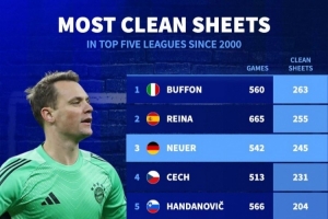 體育資訊3月27日訊 德國轉(zhuǎn)會市場統(tǒng)計(jì)了2000年以來五大聯(lián)賽門將零封場次,并列出榜單,布馮263場居首,雷納、諾伊爾排名二三位。