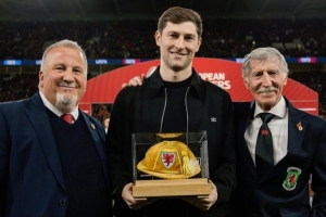 體育資訊3月28日訊 威爾士隊向本·戴維斯頒發(fā)“金色帽子”,表彰他達成威爾士隊出戰(zhàn)100場里程碑。