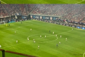 美國隊在梅賽德斯-奔馳體育場進(jìn)行本場比賽時,身著為今年夏天世界杯發(fā)布的新款球衣。這款球衣采用了美國國旗的色調(diào),球衣上印有波浪狀的紅色和白色條紋,球衣背面則有大面積的白色區(qū)域。