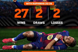 本賽季,在拉菲尼亞出戰(zhàn)的情況下,巴薩取得了27勝2平2負的戰(zhàn)績,只輸掉了6%的比賽。而在巴西邊鋒缺陣的情況下,巴薩戰(zhàn)績僅為9勝1平5負,輸掉了33%的比賽。