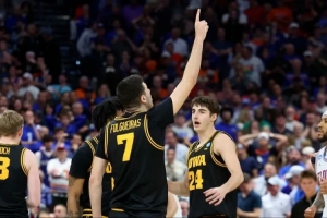 當(dāng)完賽的蜂鳴器響起的瞬間,愛荷華大學(xué)的隊(duì)員們互相擁抱慶祝,他們淘汰了衛(wèi)冕冠軍佛羅里達(dá)大學(xué),自1999年以來首次晉級(jí)甜蜜十六強(qiáng)。