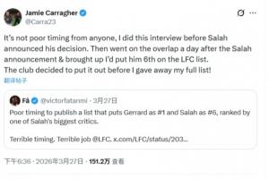 卡拉格回復(fù)這名球迷:“這絕非任何人的時(shí)機(jī)考量失當(dāng)——我早在薩拉赫宣布決定前就完成了這次采訪。薩拉赫官宣的次日,我才在Overlap節(jié)目里展開(kāi)后續(xù)話題,提到自己將他排在利物浦隊(duì)史榜單的第六位??删銟?lè)部在我公布完整榜單之前,就把這段內(nèi)容發(fā)布了出去!”
