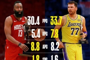 東契奇本賽季場(chǎng)均33.7分7.8籃板8.2助攻1.6搶斷,投籃命中率48%,三分命中率37%