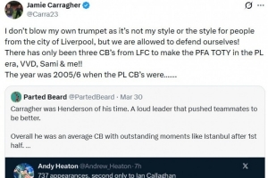 緊接著球迷Parted Beard發(fā)文反駁Heaton:“卡拉格就是他那個時(shí)代的亨德森。一個嗓門大的領(lǐng)袖,會推著隊(duì)友變得更好。但總體來說他只是個平庸的中衛(wèi),高光時(shí)刻只有伊斯坦布爾之夜半場后的大逆轉(zhuǎn)……”