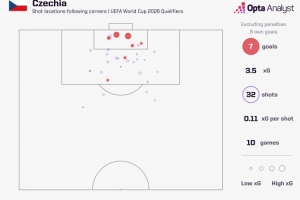 世預賽歐洲區(qū)比賽,捷克已經(jīng)通過角球打進7球,位居歐洲區(qū)所有球隊之首。