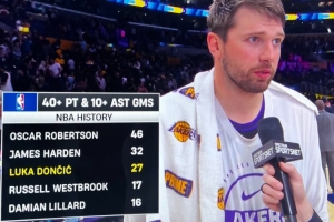 據(jù)統(tǒng)計,這是東契奇生涯第27次至少40分10助攻,歷史第三多,僅次于大O(46次)和哈登(32次)。