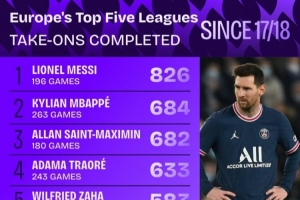 體育資訊4月1日訊 Squawka列出了17-18賽季以來五大聯(lián)賽成功過人排名,梅西826次居首,姆巴佩684次第二。