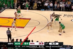 第一節(jié),凱爾特人外線箭如雨下,單節(jié)全隊三分15投11中,命中率高達73.3%,單節(jié)凈勝熱火20分。