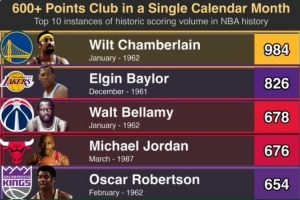 (注:上圖僅統(tǒng)計(jì)單人的最高紀(jì)錄、如張伯倫個(gè)人984為最高,但還有多次900+、800+、700+、600+)