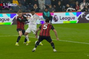 比賽的第67分鐘,阿瑪?shù)陆麉^(qū)與特呂費(fèi)爾對(duì)抗后倒地,裁判沒有表示,VAR維持判罰。隨后伯恩茅斯就地反擊將比分扳平。