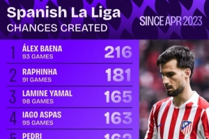 體育資訊4月2日訊 Squawka統(tǒng)計了亞馬爾2023年4月西甲首秀以來,球員在西甲創(chuàng)造機會的次數(shù),并列出榜單,亞馬爾創(chuàng)造165次機會,僅少于巴埃納、拉菲尼亞。