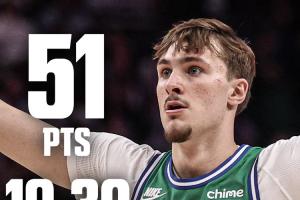 獨行俠狀元弗拉格打出生涯代表作,他全場出戰(zhàn)33分33秒,30投19中(三分9中6)、罰球7中7,狂砍51分6籃板3助攻3搶斷1蓋帽,只有1次失誤,正負(fù)值-2。