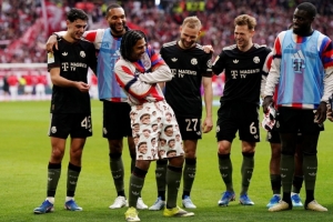體育資訊4月5日訊 拜仁在本輪德甲3-2逆轉絕殺弗賴堡,拜仁球員在賽后照例進行了慶祝。